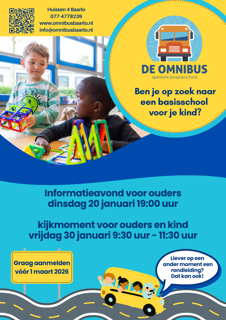 Vanaf het schooljaar waarin kinderen 3 jaar worden, kunnen ze aangemeld worden voor de basisschool. Voor zowel ouders als kind is dit een belangrijk moment. Wij vinden het dan ook heel fijn om ouders en kinderen persoonlijk te ontvangen, rond te leiden en informatie te geven. Je kunt een afspraak maken door te bellen (077-4778239) of een mail te sturen naar Saskia Doemges, directeur van OJBS de Omnibus (s.doemges@omnibusbaarlo.nl)